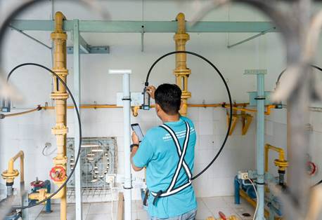 Fig 01. Caption: Drinking water technician of PDAM Tugu Tirta Kota Malang checking the chlorine dose as part of operational monitoring. Photo Credit: WHO/Rumah Drone Aerial