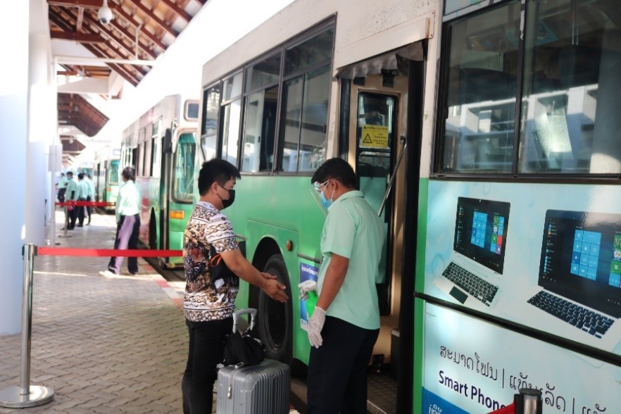 At the entrance of the bus, the operator checked the hotel destination while providing hand sanitizer to the passenger before boarding. Dr Mark Jacobs, WHO Representative to Lao People’s Democratic Republic said “WHO is pleased to have supported the coordination of multiple ministries like the Ministry of Health, Ministry of Public Works and Transport, and the Department of Civil Aviation since the start of the pandemic. The management of incoming travellers has been critical in reducing the risk of COVID-19 entering Lao PDR. It has been a central part of the Government’s approach to protecting the people of the country from the pandemic.”